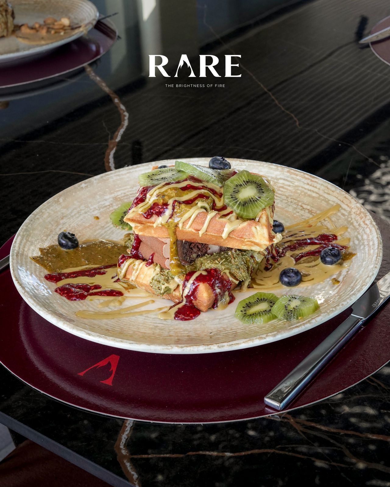 Alliance de brownie fondant et croustillant pistache sur une gaufre chaude, finition kiwi.